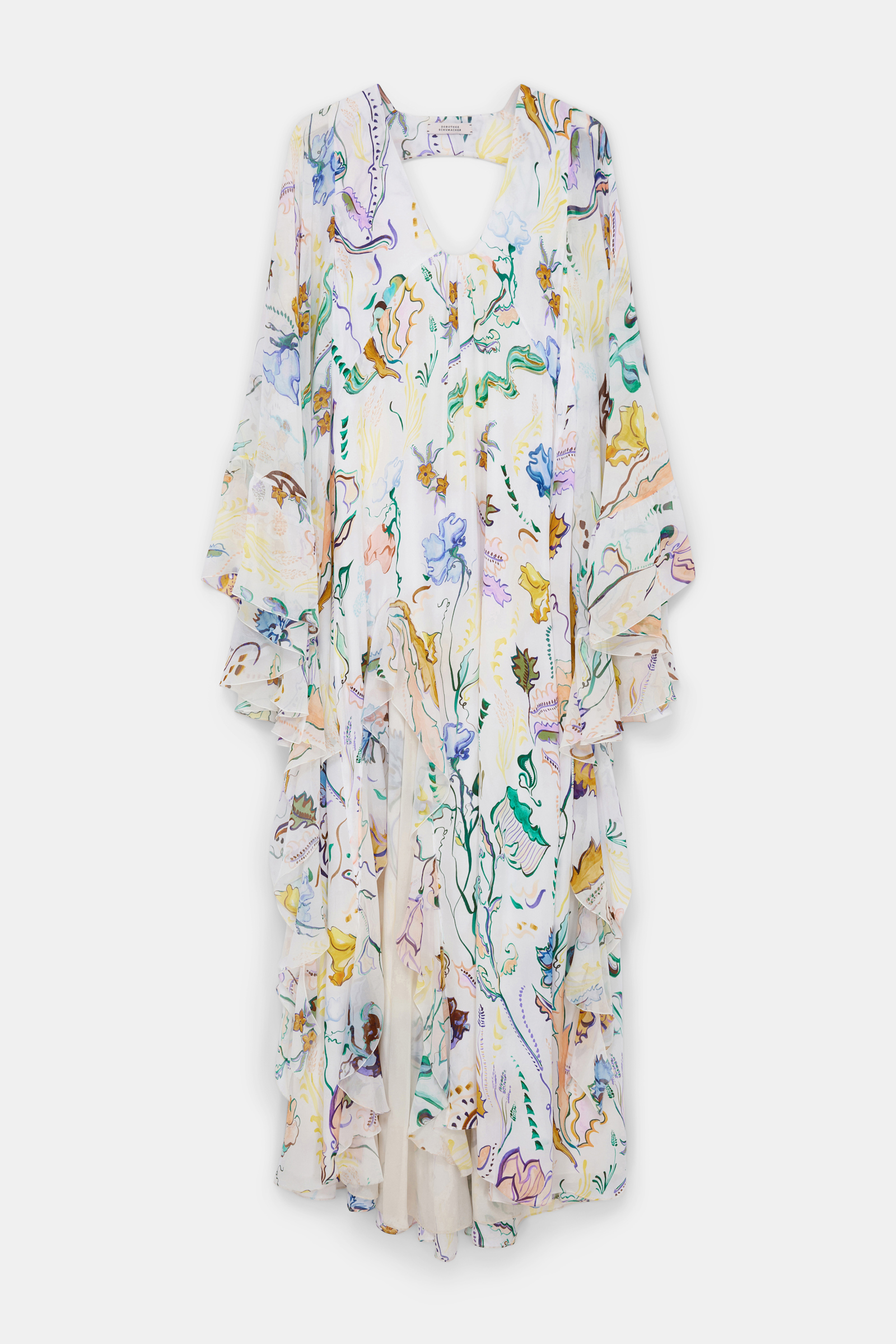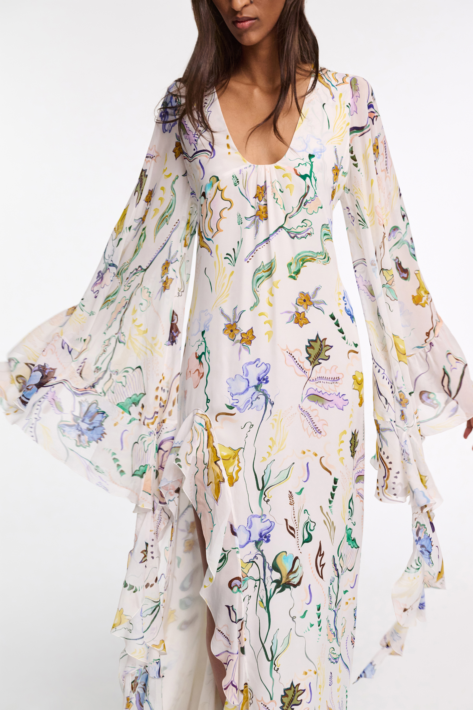 Your new dreamdress: Das Kleid überzeugt mit einem floralen Signature-Print und einer fließenden Maxisilhouette. Ein tiefer Rückenausschnitt, voluminöse Ärmel und Volant-Detail zeichnen das Key Piece aus. Ein abnehmbares Schal-Detail ermöglich different-ways-to-wear.