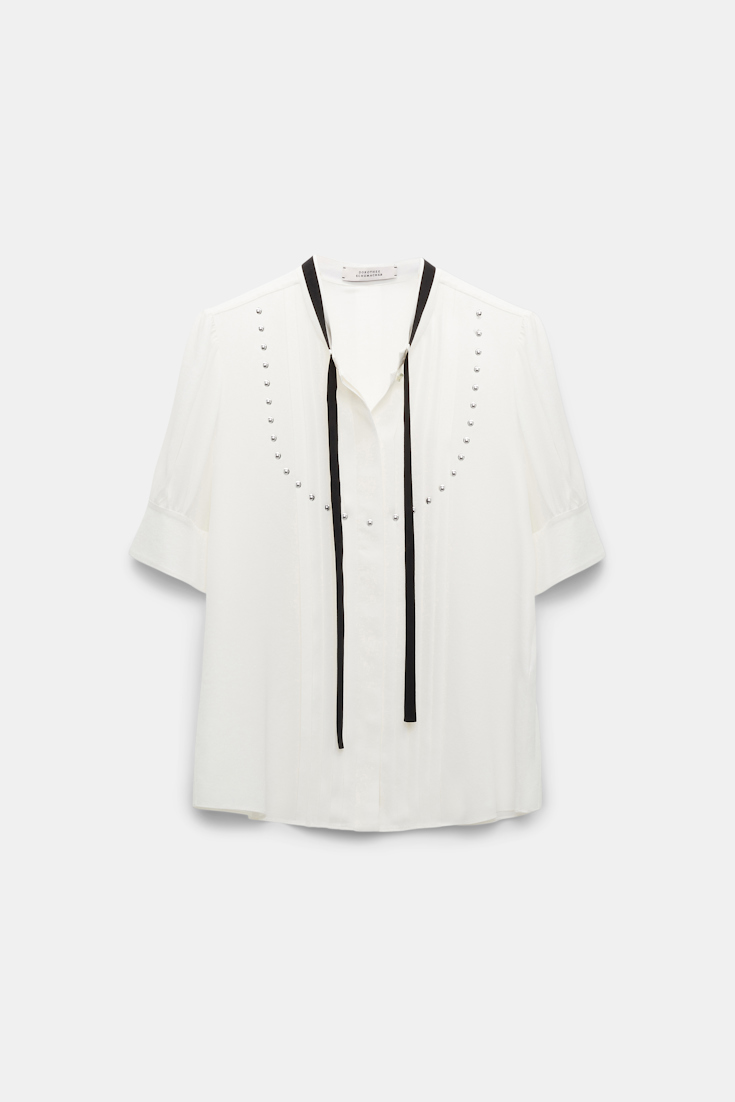 Die Bluse aus Seiden Crêpe de Chine hat einen 1/4 Arm und eine figurnahe Silhouette. Der Plastron wird durch Biesen und Nieten ausgezeichnet, der Stehkragen wird durch ein schwarzes Bindeband ergänzt.