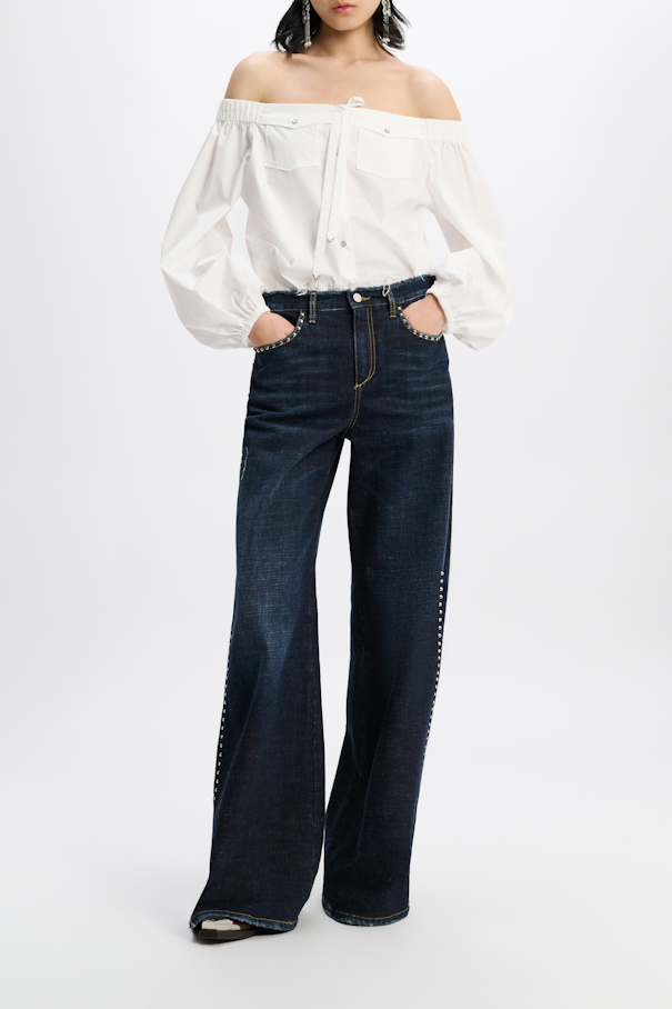Die Bluse aus Baumwoll-Popeline hat eine Off-shoulder Silhouette. Durch die elastische Neckline ensteht ein angenehmes Tragegefühl. Bänder mit Metallenden, eine Knopfleiste und Ziertaschen mit Perlmutt Druckknöpfen verleihen der Bluse Western-Vibes.