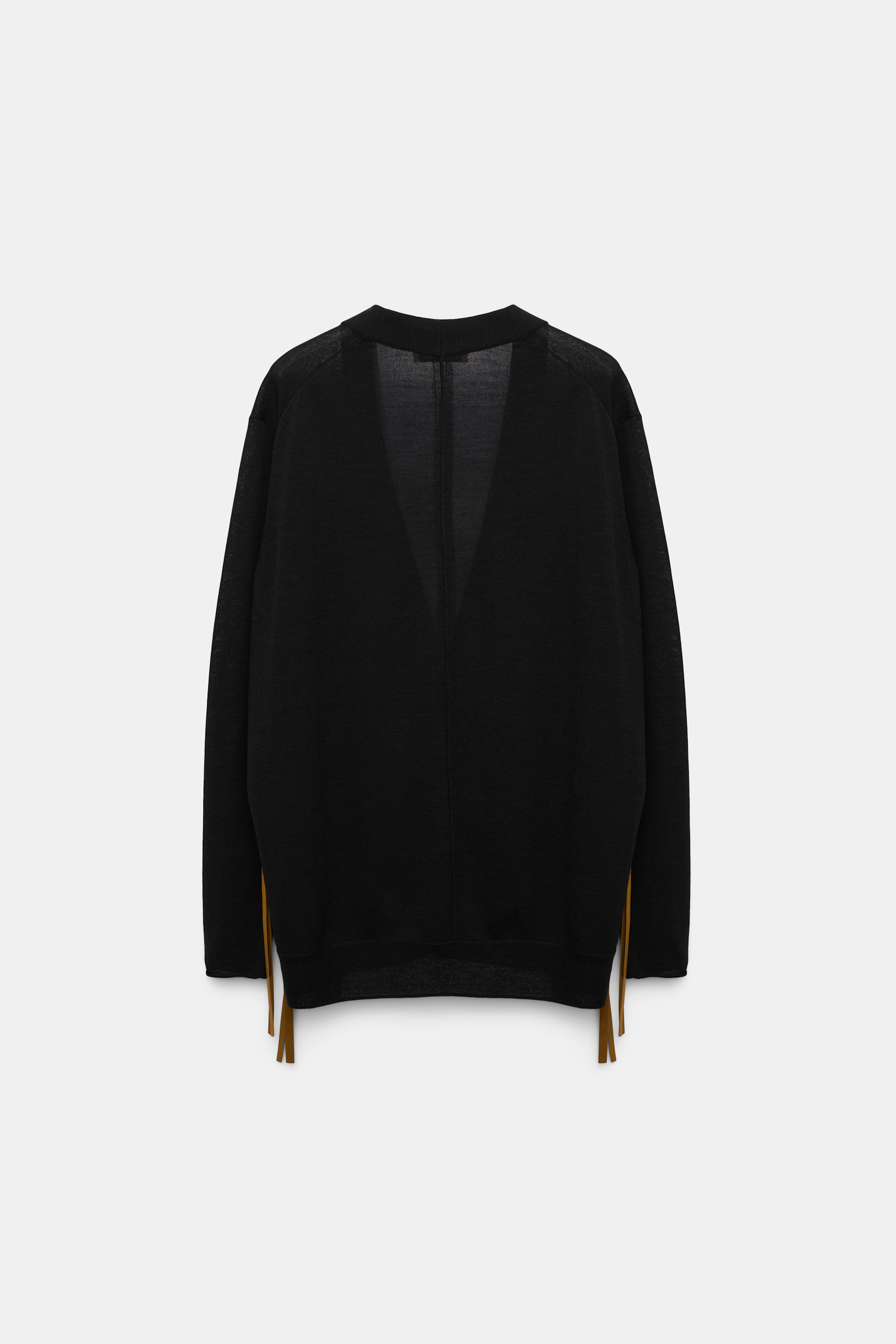 It's all about the details: Der Cardigan aus einer weichen Woll-Baumwoll-Mischung hat einen V-Ausschnitt und eine verdeckte Knopfleiste. Er zeichnet sich durch seitliche Gürtelbänder aus Eco-Veloursleder und aufgesetzte Taschen aus. Überschnittene Schultern und entspannte Ärmel mit Rollsaum sorgen für einen lässigen Look.