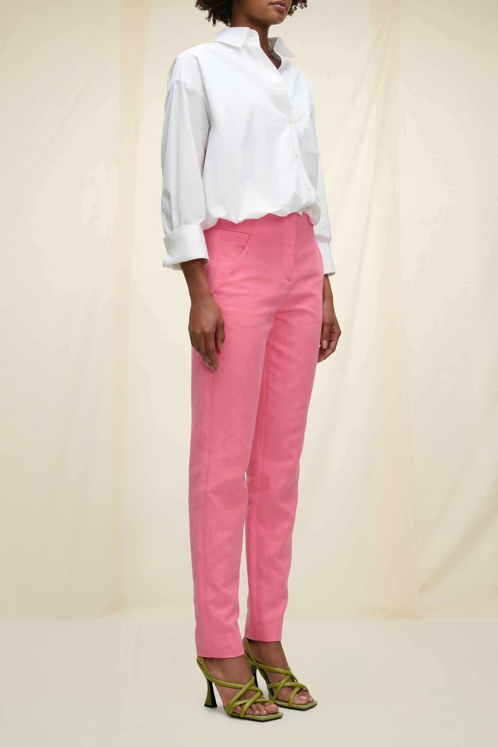 The lightweight pants are crafted in a cooling mix of cotton and linen. The clean silhouette is fitted and comes to a slight taper at the ankle. The pants are full length.