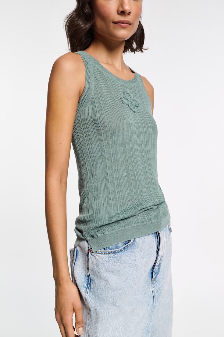Everything is rosy. The linen blend tank top is ribbed and has a round neckline. The fitted style has D-rose embroidery at the throat and crochet-like ribbed trim.