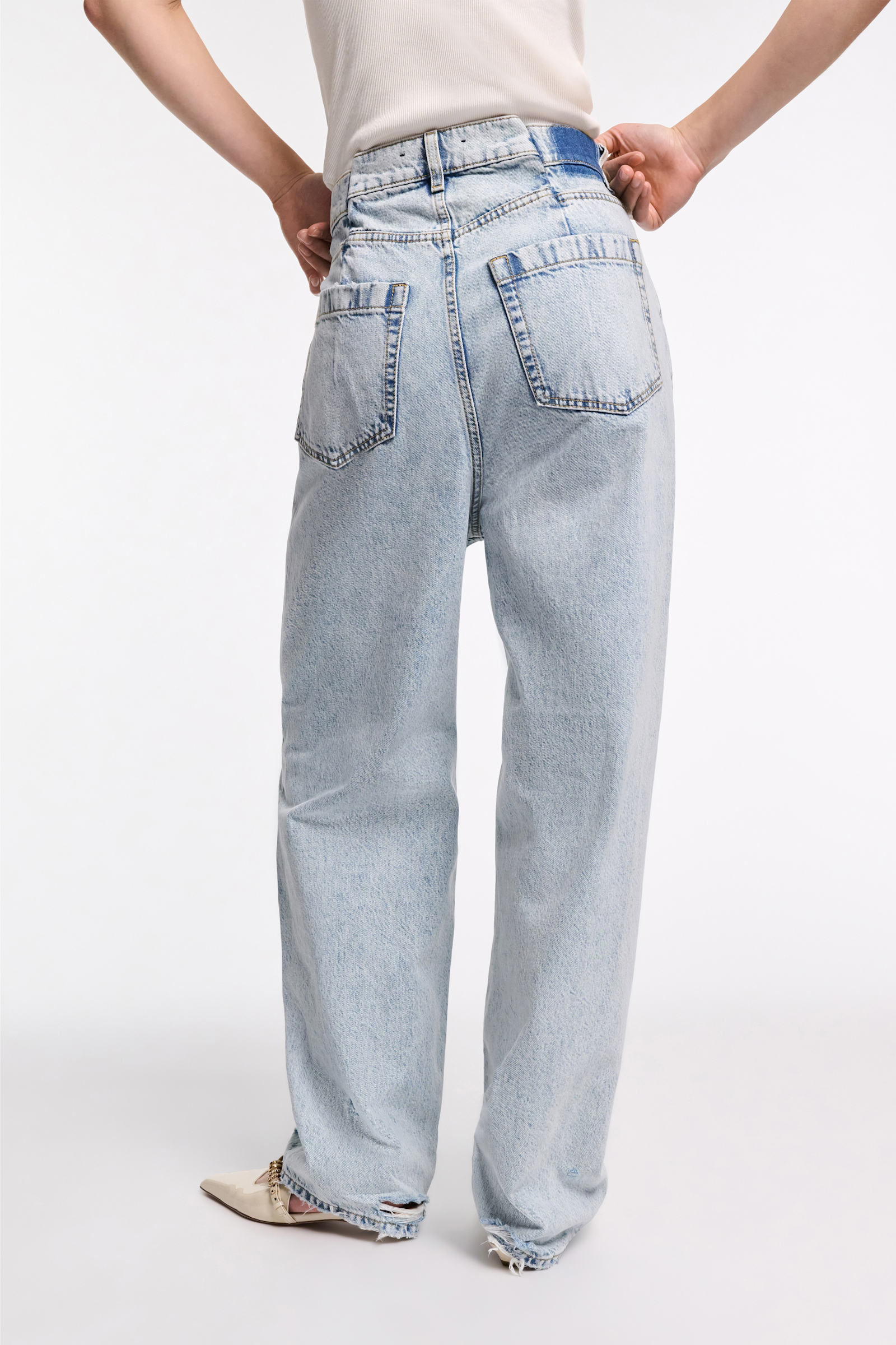 The baggy jeans have a witted peg waist and tapered leg. The 5-pocket style is distressed at the ankles with a soft frayed hem.