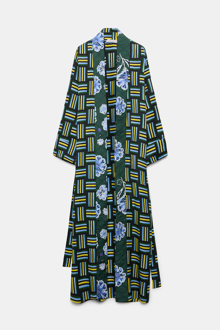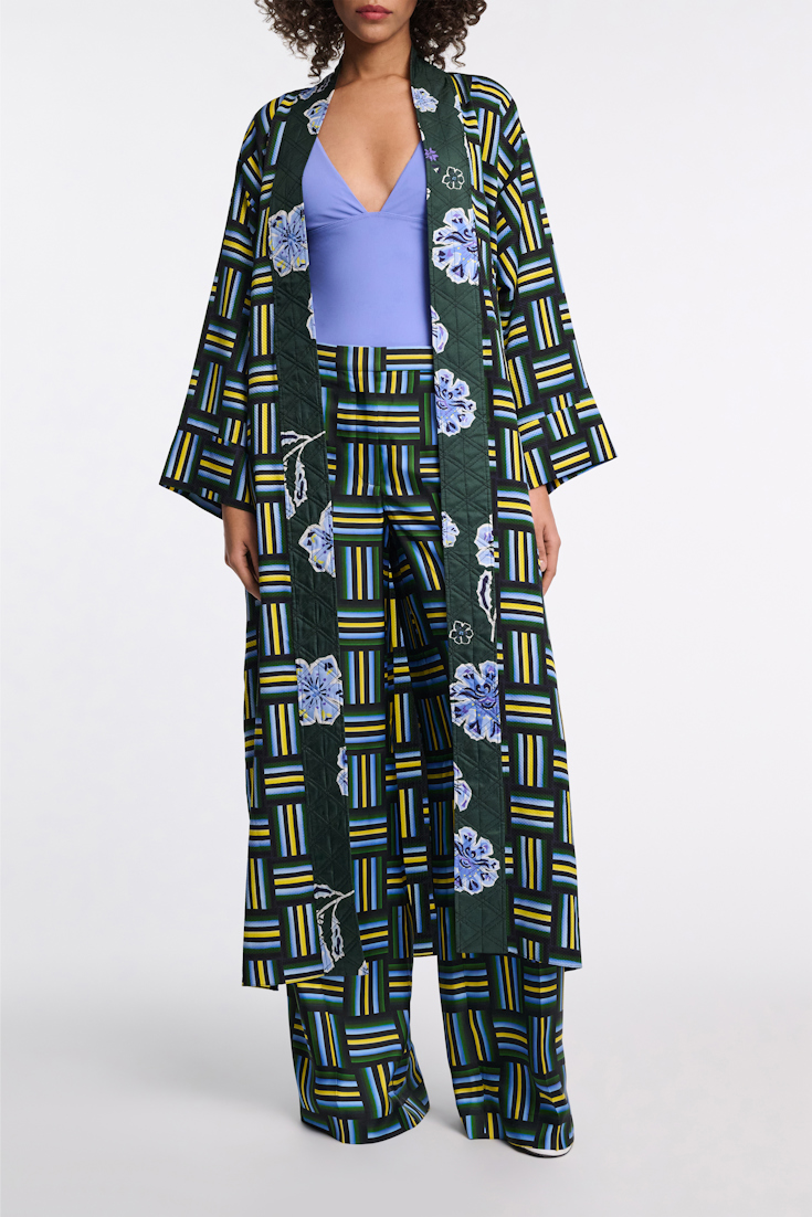 Dreaming about this…The silk jacquard pajama coat has a double sided print and ankle-grazing length. The relaxed, open front style has a quilted shawl collar and flared long sleeves. The coat comes with a self-tie sash.