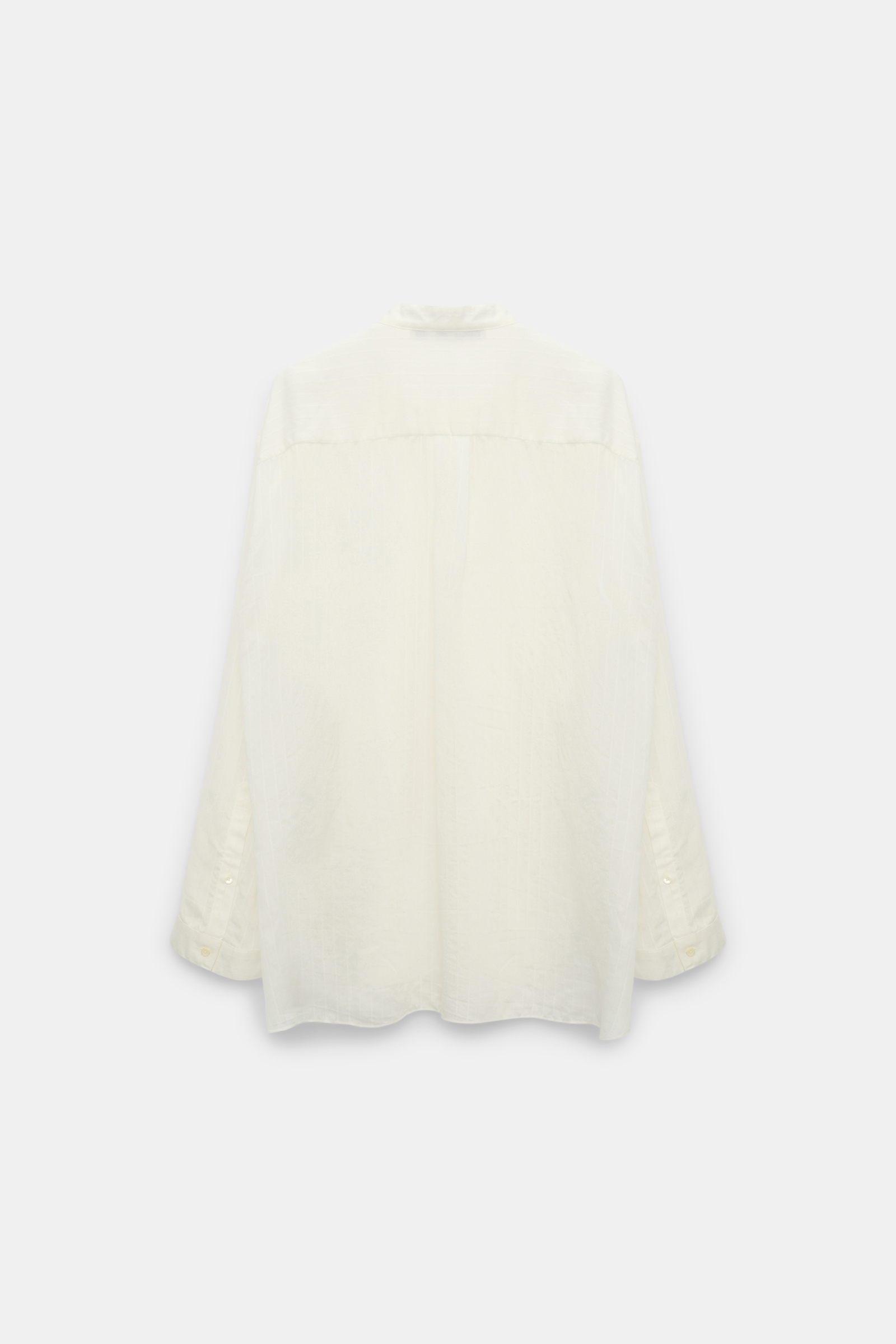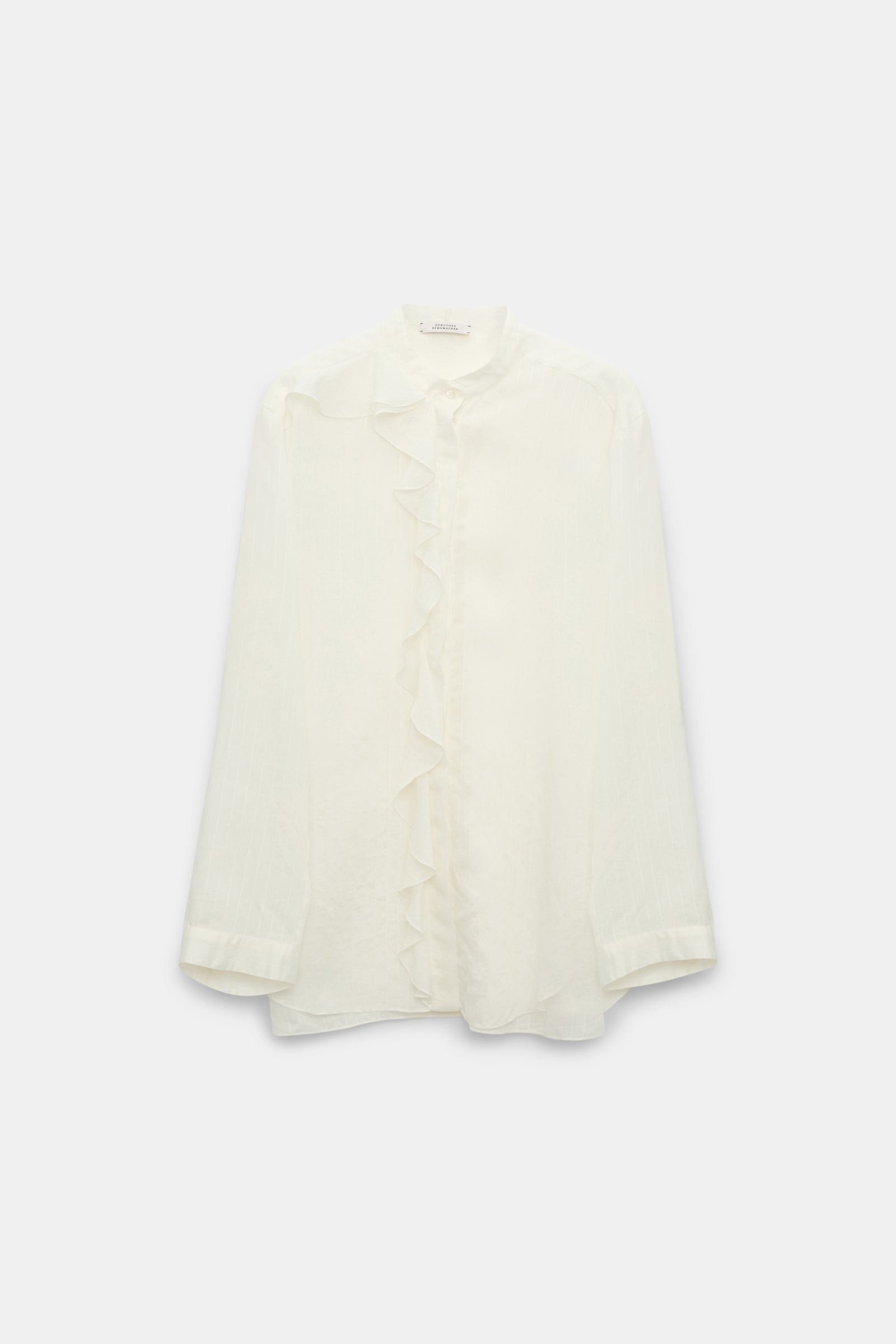 The collarless blouse is made from a striped viscose-silk mix and has ruffles down the front. The blouse comes with a matching scarf, which falls into a soft flounce at the ends.