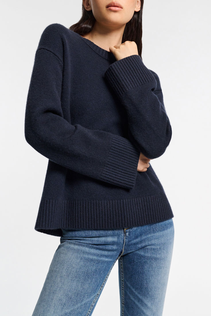 All you need: The round neck sweater is made from a cashmere blend that feels extra soft against your skin. The relaxed essential has dropped shoulders and wide long sleeves, which are finished with ribbed cuffs.