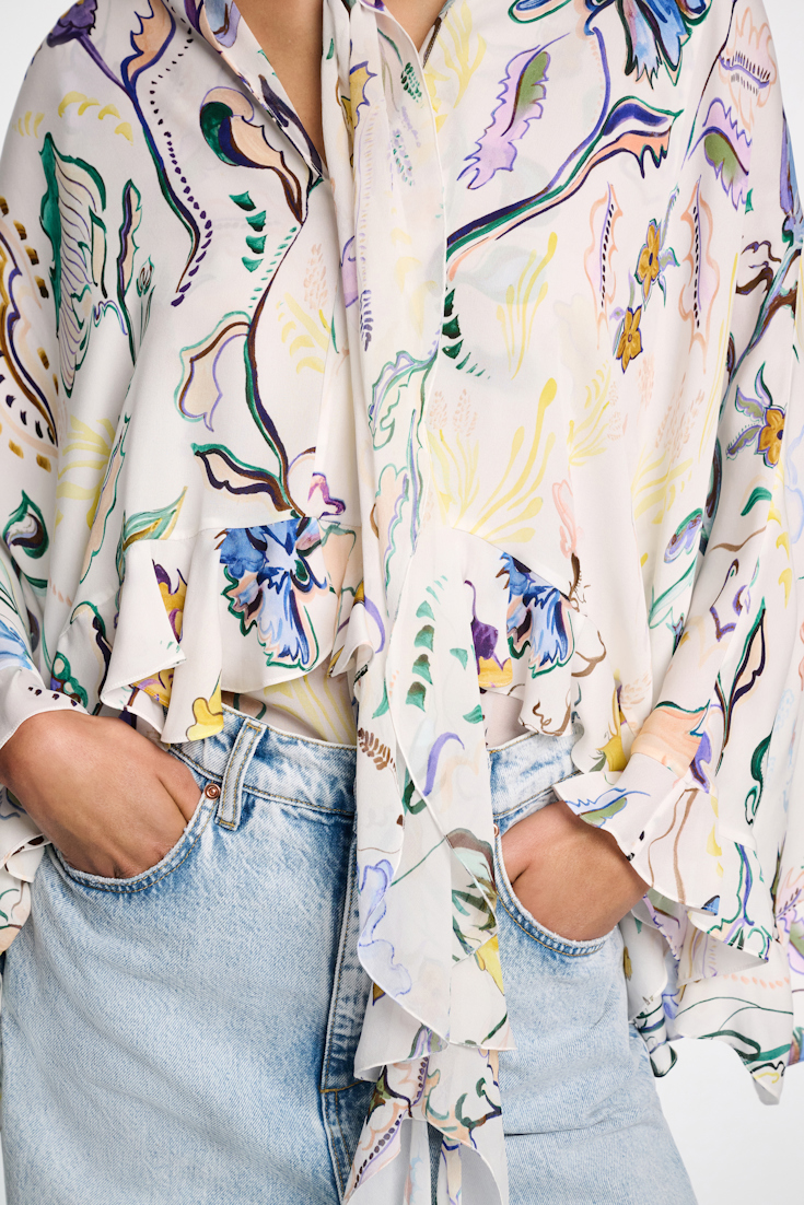 The dynamic blouse is made from printed double silk georgette. The blouse has an oversized, cape-like drape and is finished with ruffle flounces at the cuffs and hem.