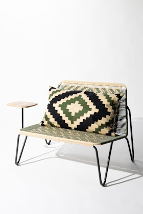 Handcrafted in Colombia by weavers, the "Prii" love seat from Tucurinca features a larger sitting area and attached wooden side table. The frame of the chair is made of powder-coated steel, and the seat is hand-woven in PVC. The love seat is designed for indoor use or outdoors in a protected, covered setting. Please note that shipping times may vary. Customer Care will contact you to arrange your delivery date.