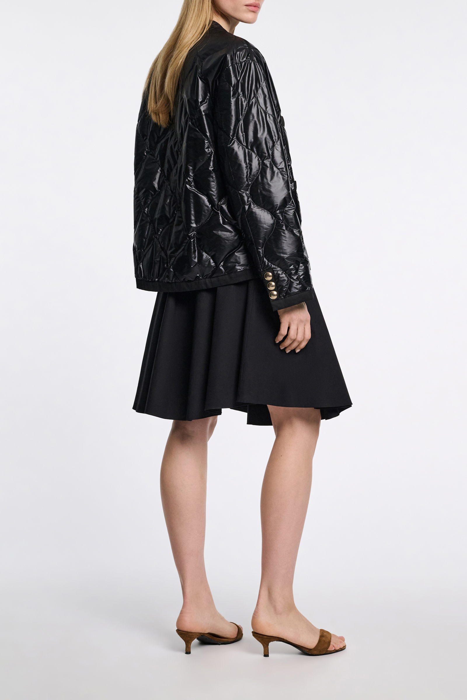 On the go? Grab this jacket: The quilted nylon jacket tucks neatly into a pocket bag. The collarless style has tonal cotton trim and gold-tone buttons.