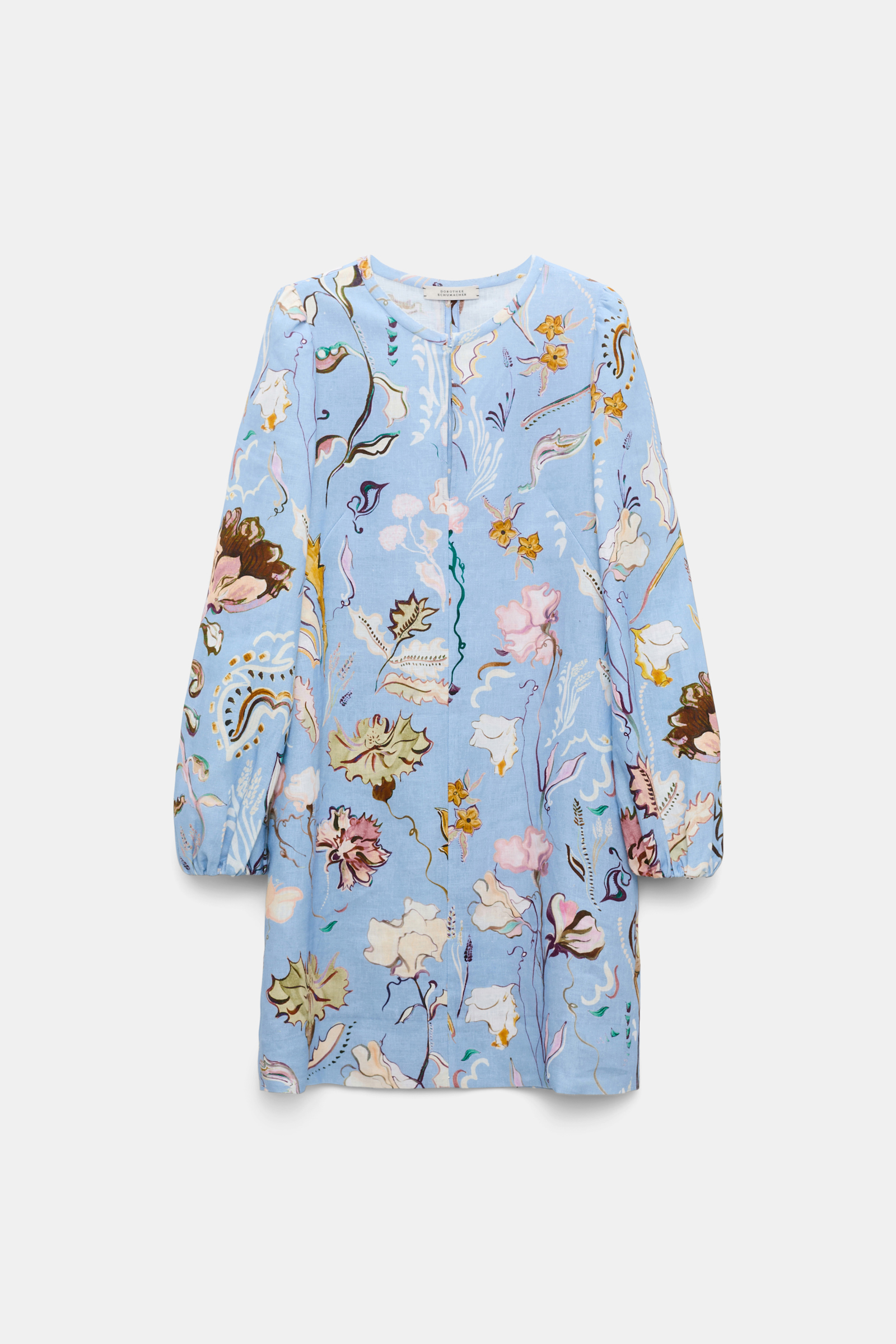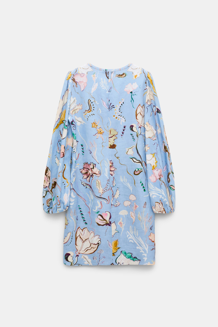 The printed linen shift dress has a round neckline which is accentuated by a silk georgette flounce scarf. The dress has voluminous sleeves and a thigh-grazing length.