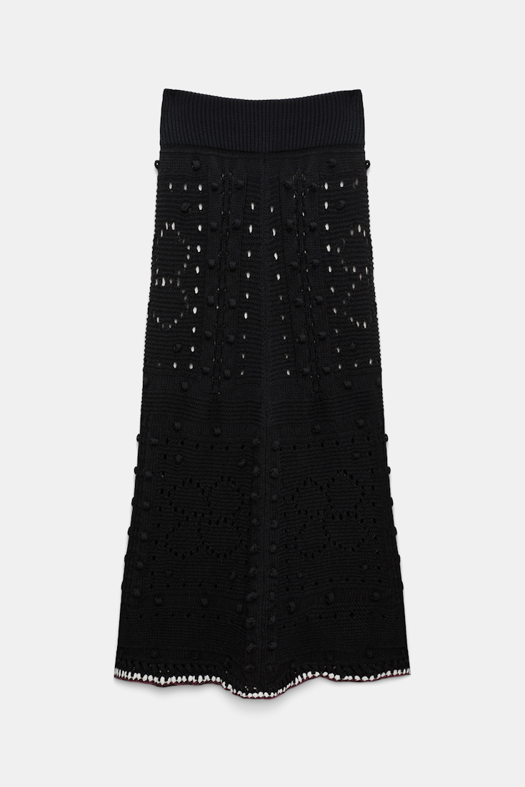 Let's talk details: The maxi skirt is knit in a cotton blend and has stitch and D-rose pointelle patterning. The ankle-grazing style has contrast crochet trim on the hemline.