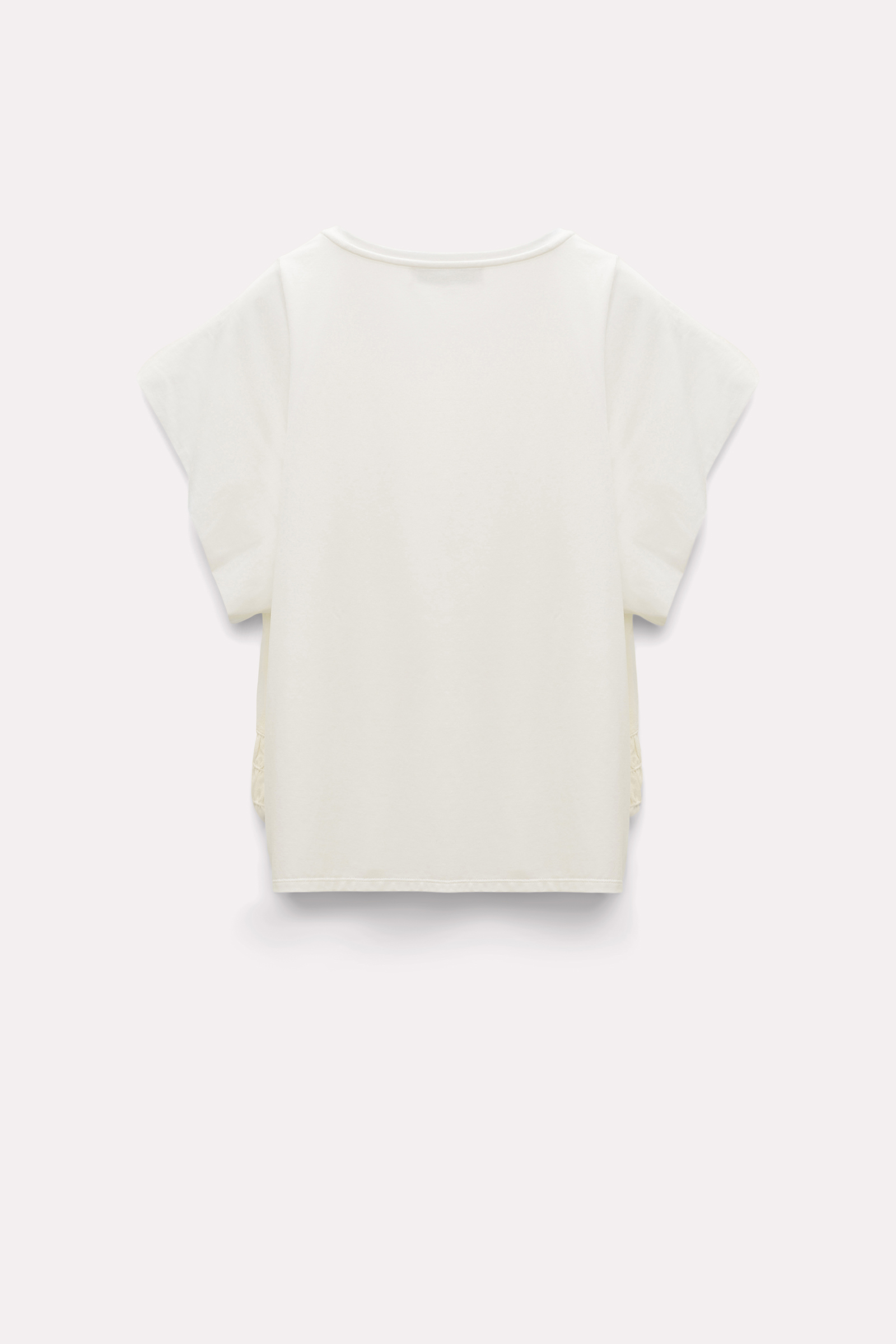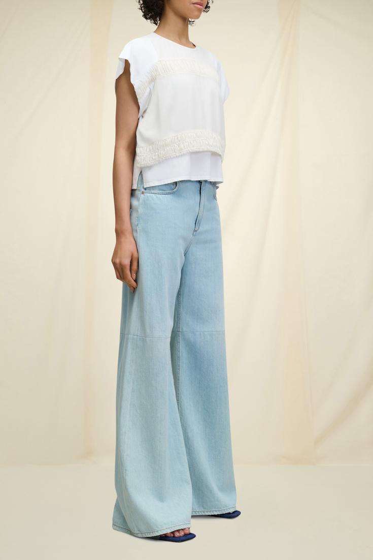 The round neck top is dressed up on the front with tonal ruched trim across the top and along the layered hemline. The sleeves are wide and draped, creating a pretty flutter on the arm.