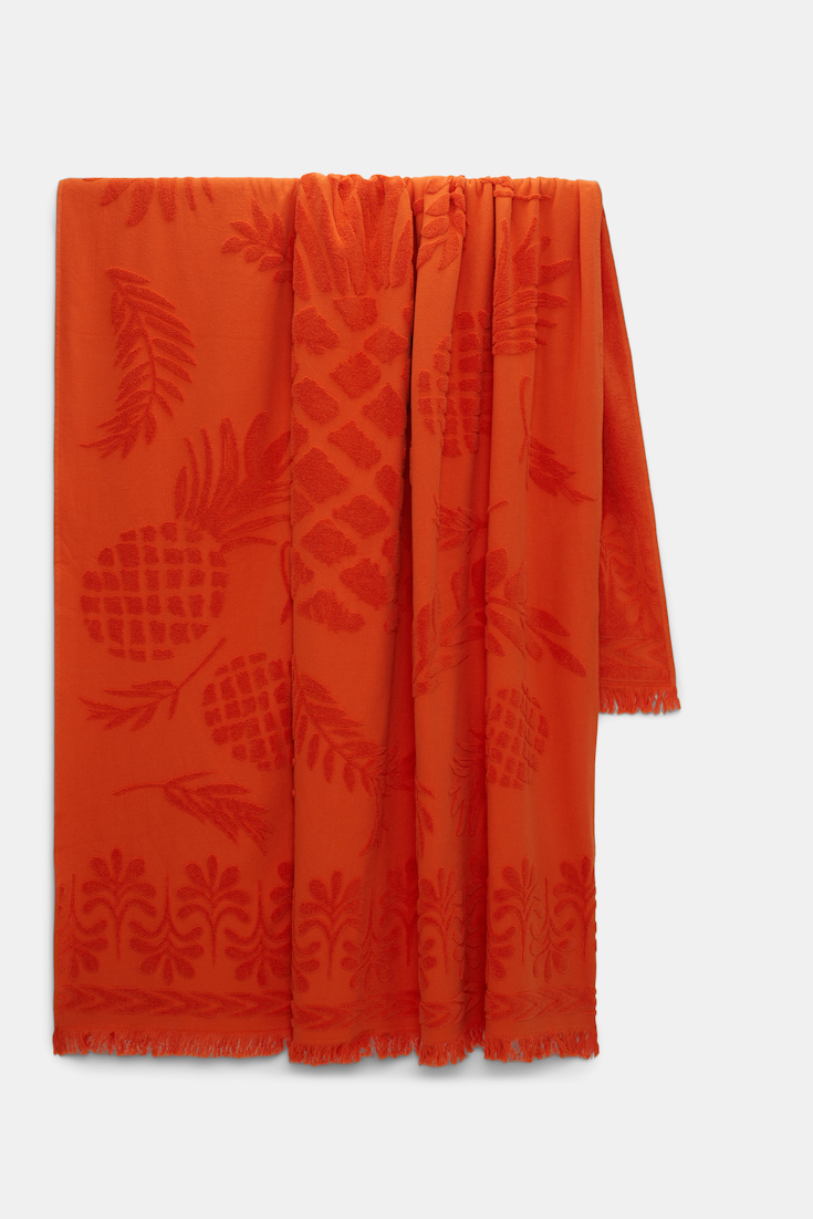 The oversized cotton towel has fringed edges and is garment dyed. The towel has jacquard pineapple patterning, which was developed in-house.