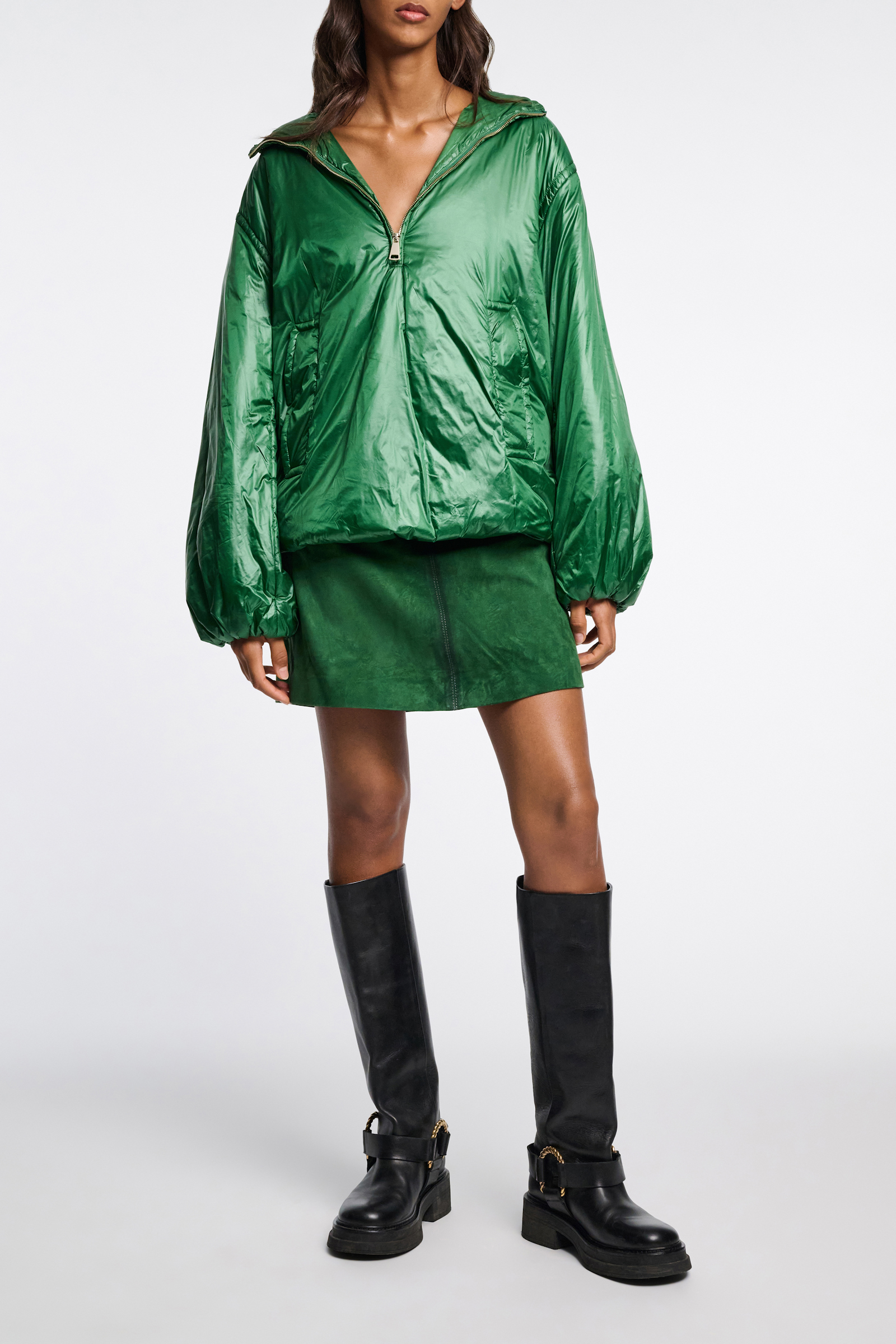 The anorak-style jacket is made of shiny nylon. The jacket has a partial front zip closure and XL patch flap pocket on the back. The jacket is slightly oversized and has a drawstring hood and hem.