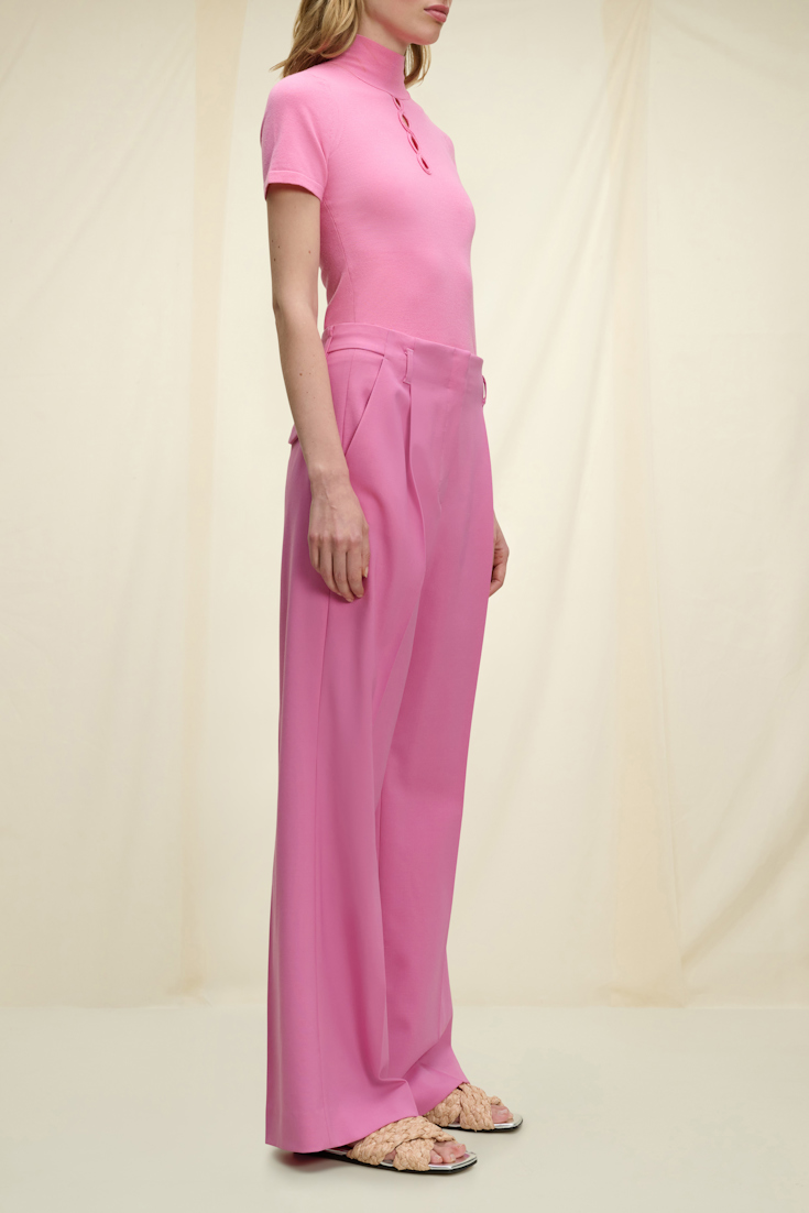- High neck wool-silk mix sweater with short sleeves and decorative cutout patterning