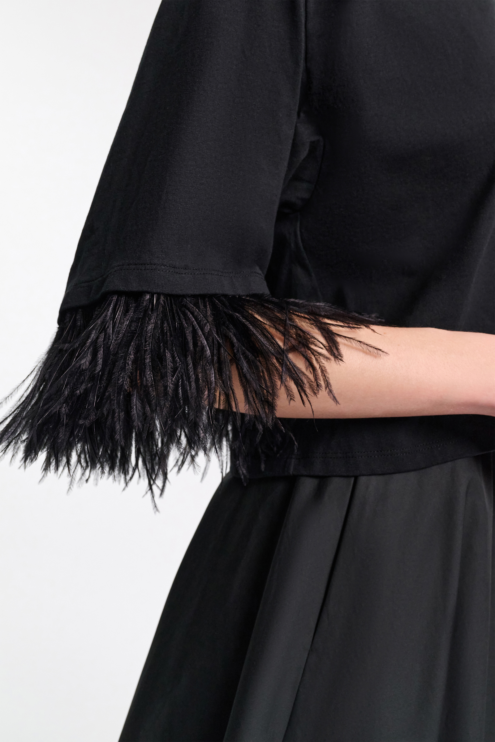 The boxy cotton T-shirt is crafted in heavy weight single jersey and features half sleeves with removable ostrich feather trim.