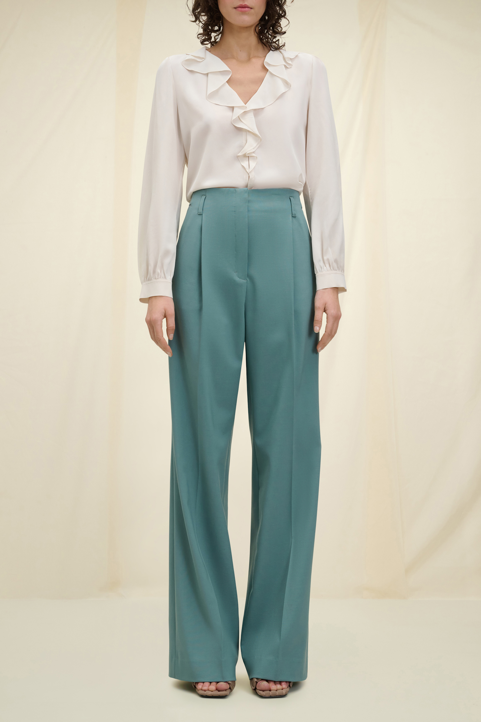 Flowey and cascading with ruffles, the silk V-neck blouse is feminine and so pretty when paired with wide leg pants.