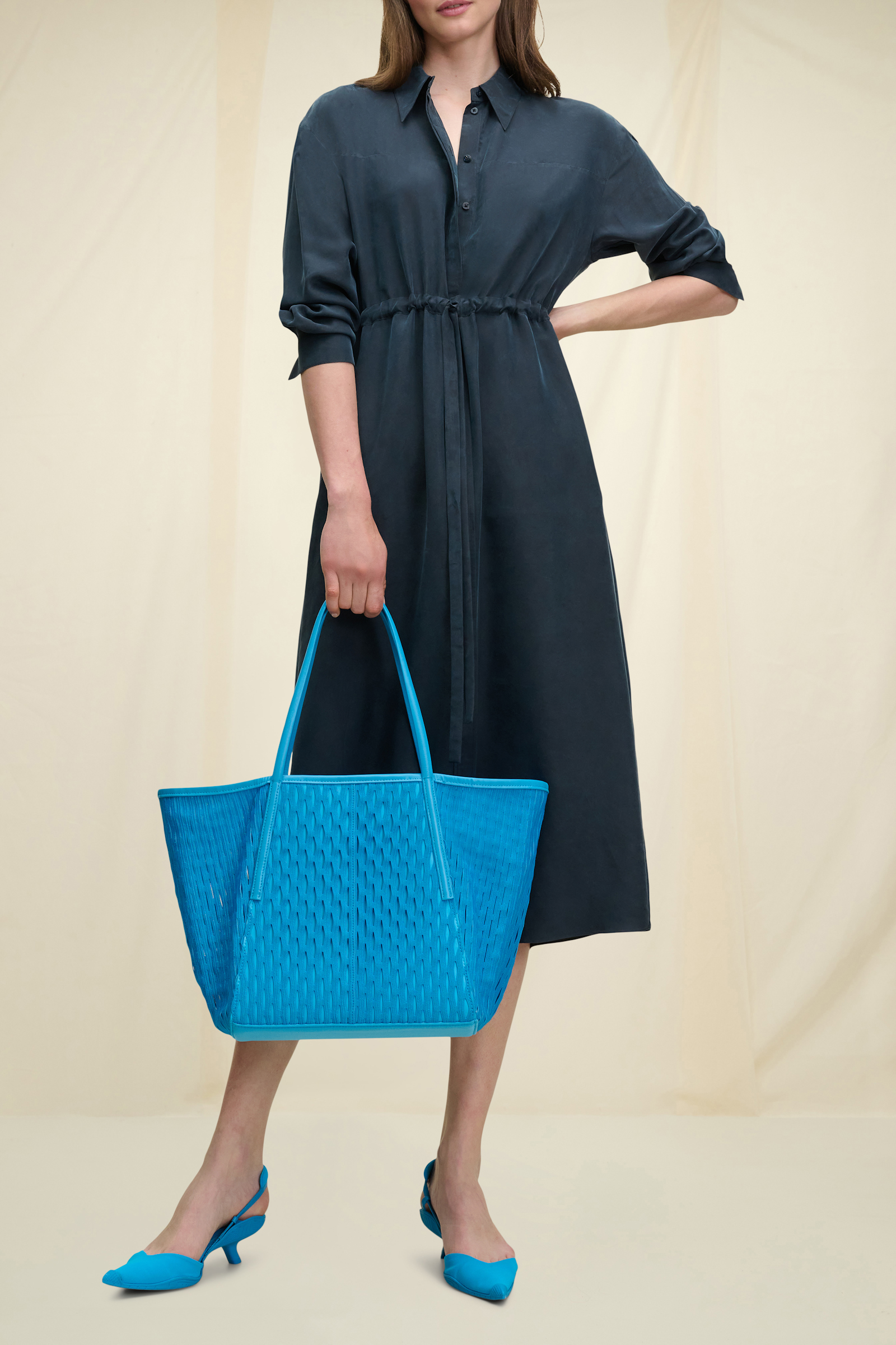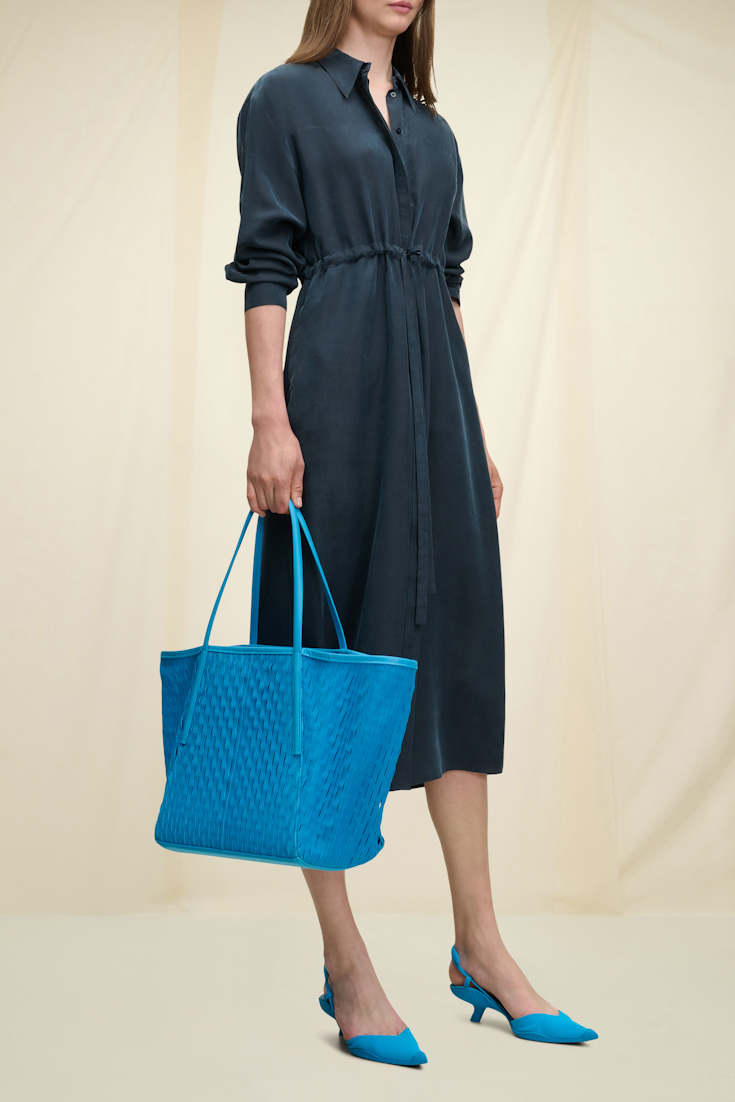 The bright, double-handle tote is detailed in stretchy open mesh. The base of the bag is neoprene, with detailing in matching leather.