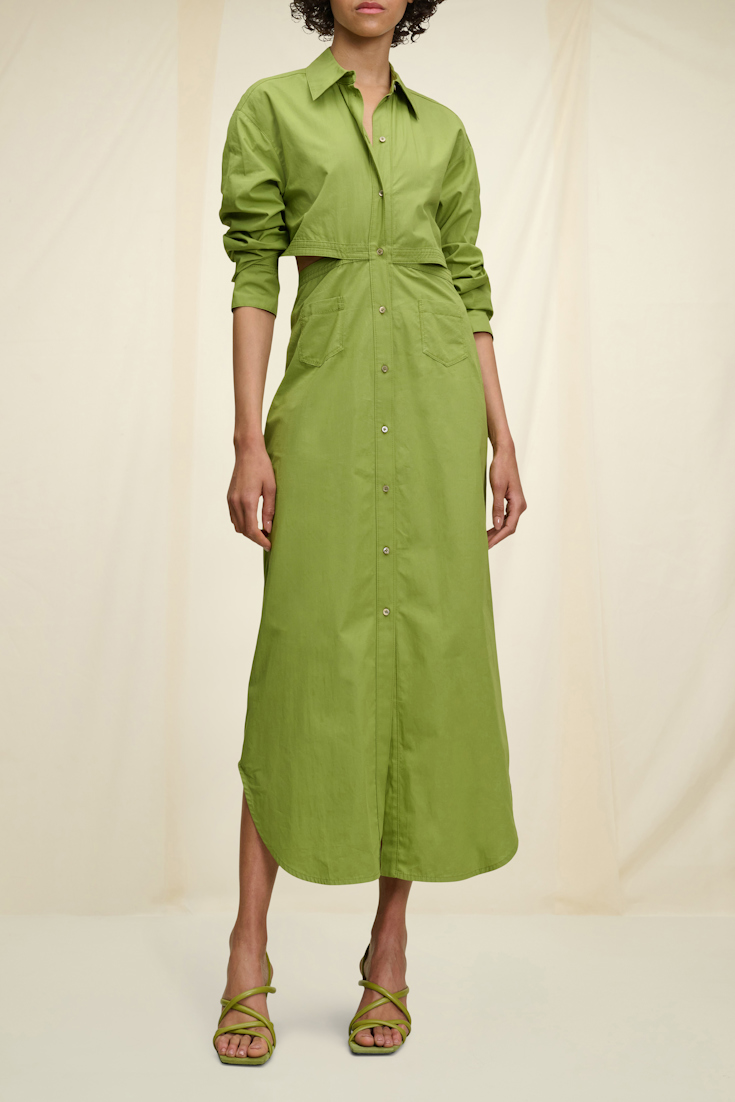 The crisp cotton shirtdress is defined by its cape-like back, which is bare underneath. The style buttons up the front and has a shirttail shaped hemline.