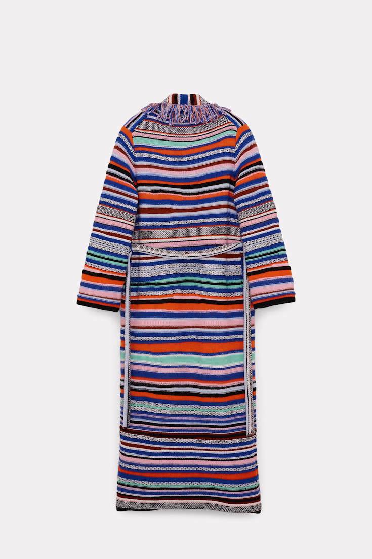 Statement making? Check. The floor-length striped knit coat is bright and beautiful with a cascade of soft fringe.