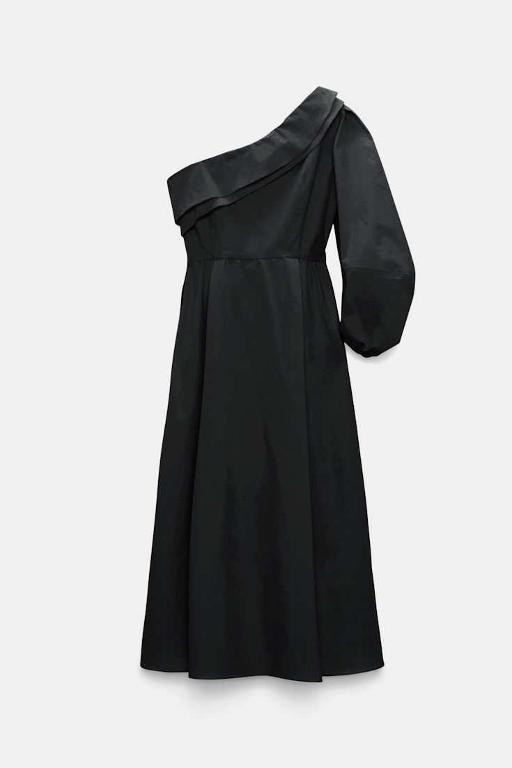 This bouquet is for you: The midi dress is made from cotton poplin and has a single voluminous sleeve. The dress has ruffle trim around the top and an XL flower brooch, which can be removed with a pin closure.