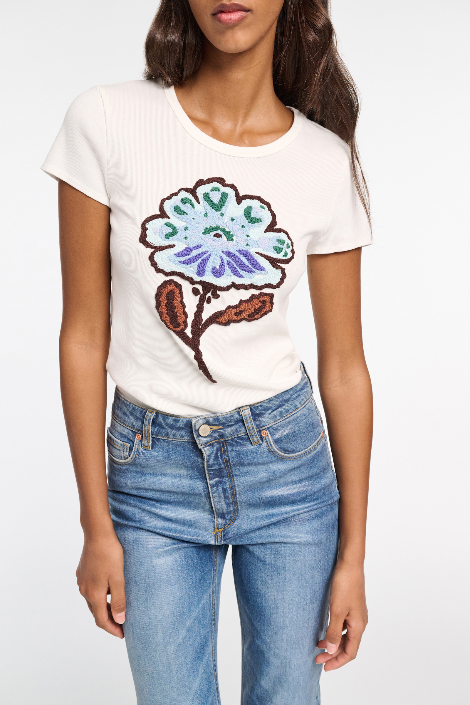 Fine rib T-shirt with flower embroidery