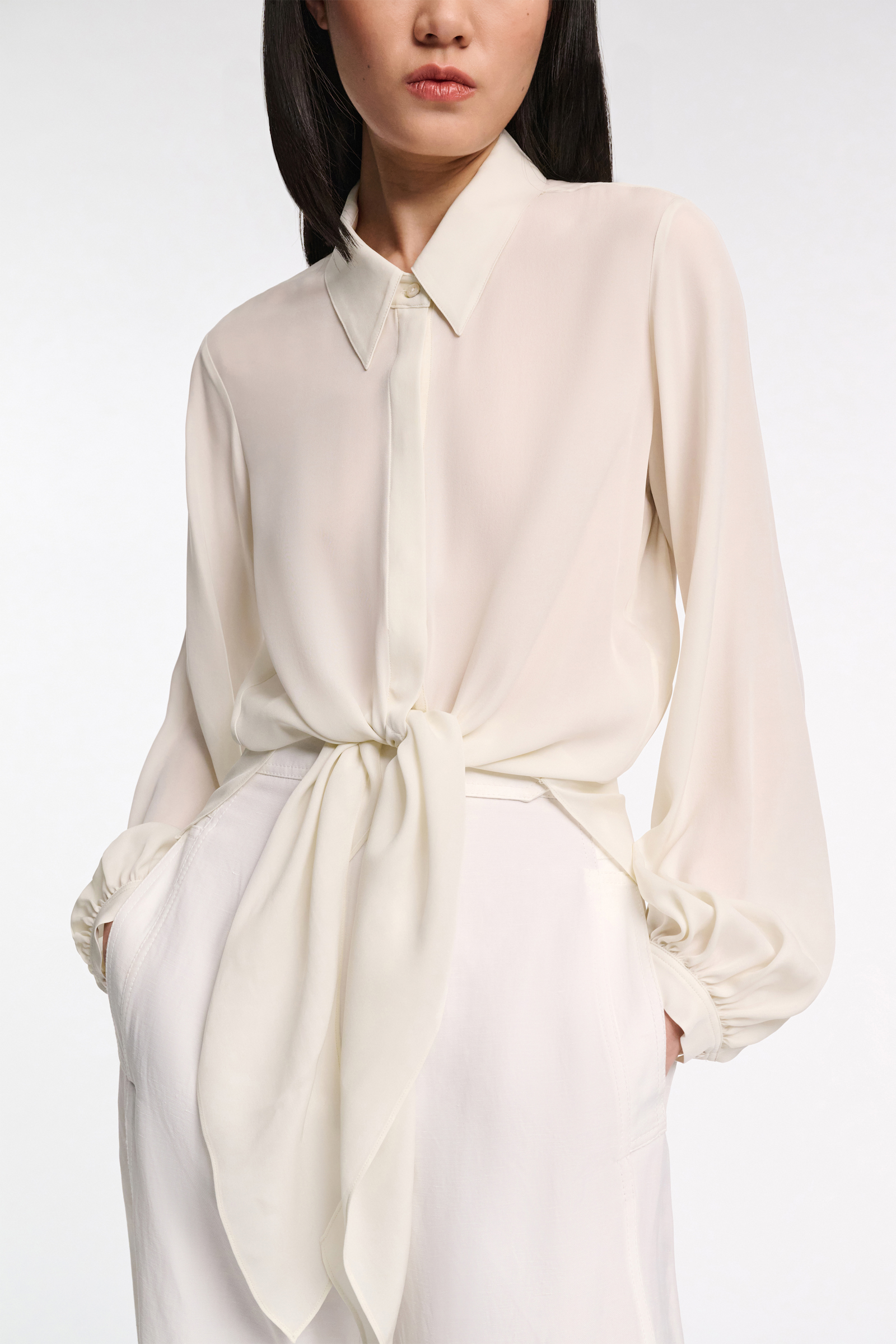 The blouse is made from double silk georgette and ties at the front. The blouse has causal volume in the body and loose long sleeves with fitted button cuffs.