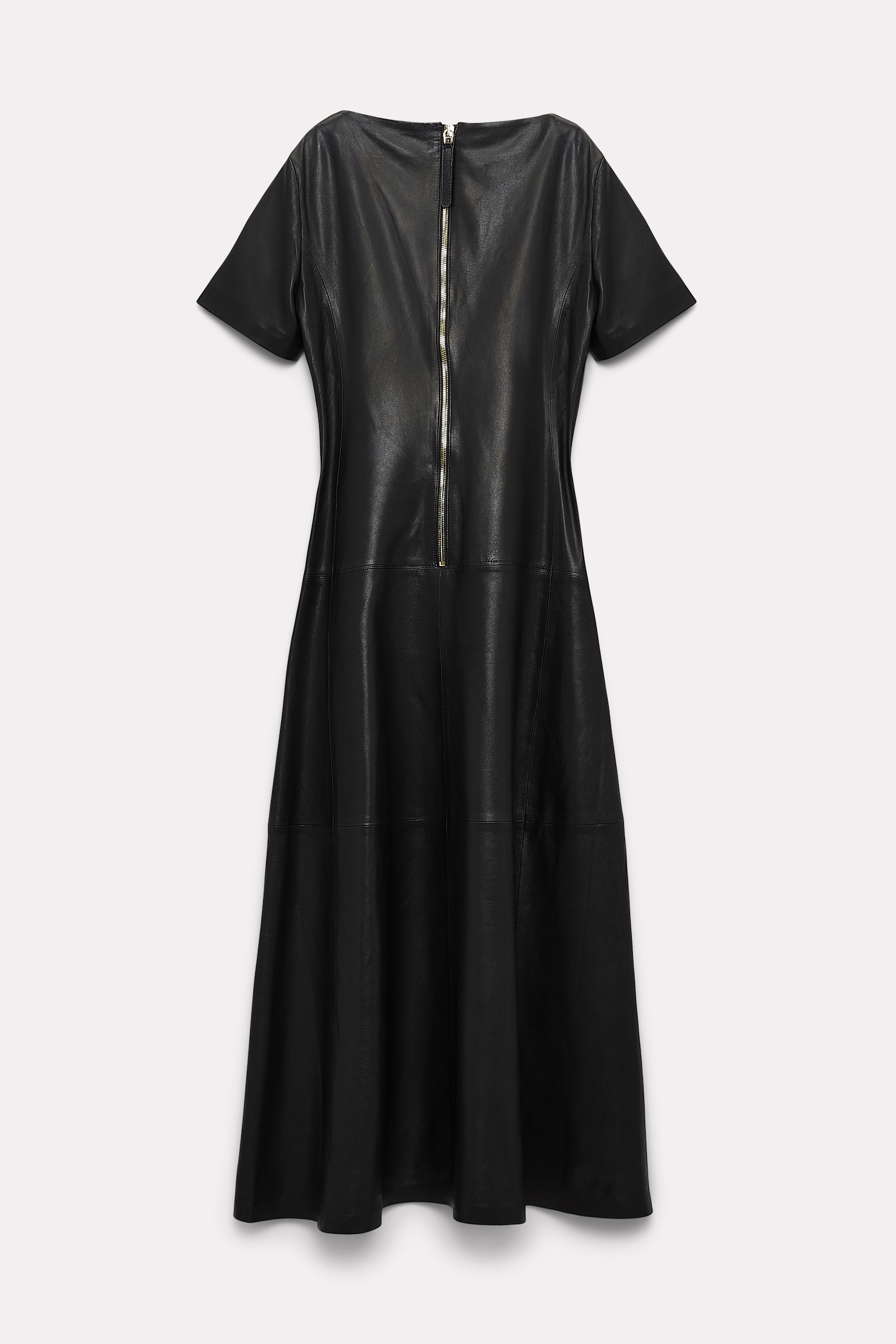 The short sleeve dress is crafted in buttery soft lambskin and is fully lined. The fit and flare silhouette is created with contour patchwork patterning. The dress closes in the back with an extra long metal zipper.